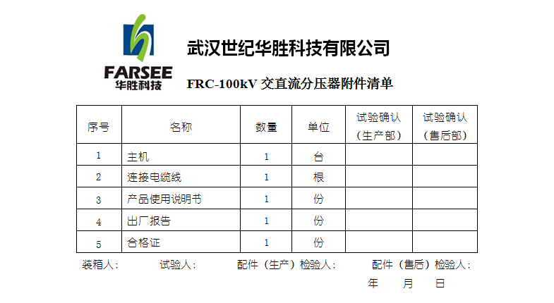 分壓器(千伏表)是高電壓試驗中必備的測量設(shè)備,它能將高電壓轉(zhuǎn)換為可用普通電壓表測量的安全低電壓,其測量準(zhǔn)確性、直觀性及使用方便性是傳統(tǒng)測量高電壓采用的靜電電壓表、測量球隙等所無法比擬的。華勝FRC系列高電壓分壓器(千伏表)測量準(zhǔn)確、使用方便安全,符合國家新頒布電力行業(yè)標(biāo)準(zhǔn)《高電壓分壓器測量系統(tǒng)通用技術(shù)條件 DL/T 846.1—2004》要求。
