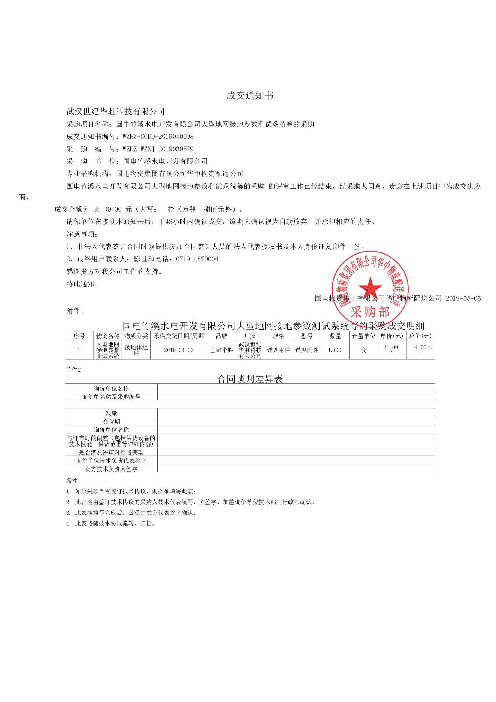 ? ? 武漢華勝公司電子商務(wù)部經(jīng)過(guò)大家的不斷努力,最終拿下“國(guó)電竹溪水電開(kāi)發(fā)有限公司大型地網(wǎng)接地參數(shù)測(cè)試系統(tǒng)等的采購(gòu)”項(xiàng)目。